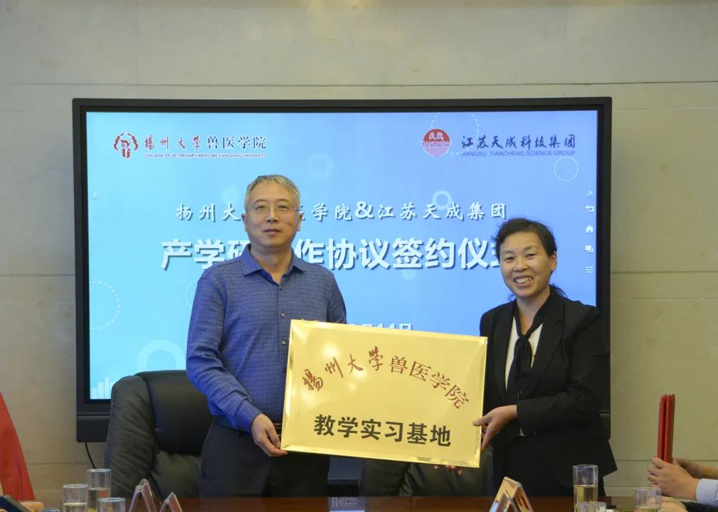 扬州大学兽医学院党委副书记沙爱红与江苏天成科技集团常务副总王文郁,进行“扬州大学兽医学院实践教学基地”签约和授牌。