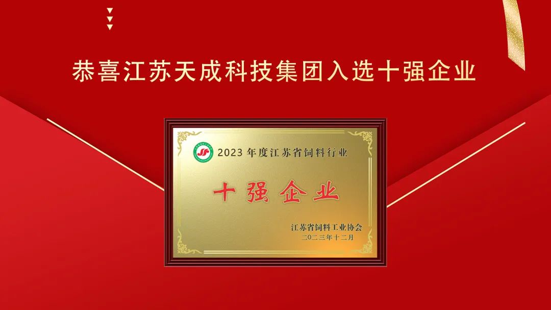 【概要描述】协会表彰一批为江苏省饲料工业发展做出突出贡献的企业,江苏天成科技集团荣获“2023年度江苏省饲料行业十强企业”。