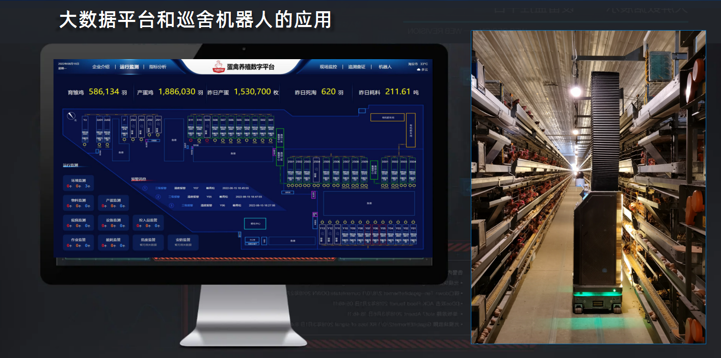 李卫民介绍,AI巡舍机器人除了帮助判断鸡的健康状况,还能同步收集鸡舍内温度、湿度、氨气量等数据,配合近年来陆续引入的环境监控调节、精准饲喂、疫病诊断预警等自动养殖功能,做到不进鸡舍门也能了解情况。目前,该养殖基地鸡舍内已全面使用AI巡舍机器人,对弱鸡、病鸡的判断正确率超95%。自数字养殖平台上线后,该企业蛋鸡产蛋率提升1.5%,存活率提升2%到3%,鸡蛋中沙门氏菌与大肠杆菌等多项检测达到零检出。