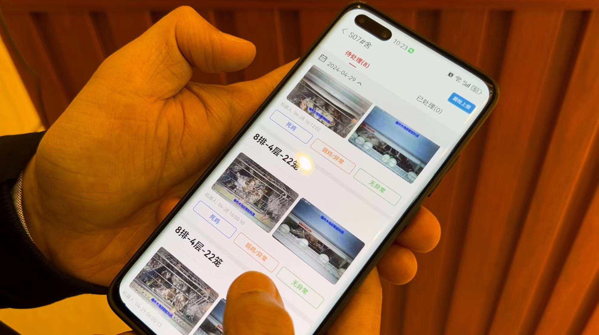韩良均拿出手机打开天成科技集团禽蛋养殖数字平台应用程序,点击进入编号S#07的鸡舍,一张如同围棋盘的“鸡舍地图”展现眼前。每一个格子就代表一间养殖笼,其中几个鲜艳的红色格子就是机器人探测到异常蛋鸡的具体位置。韩良均点击一格红色格子,立马弹出一张蛋鸡的大头照,一旁标注“绝产鸡”字样。“鸡冠无色泽,羽毛杂乱,符合绝产鸡外形特征。”韩良均通过大头照,对蛋鸡身体状况进行二次判断,与AI得出相同结论。